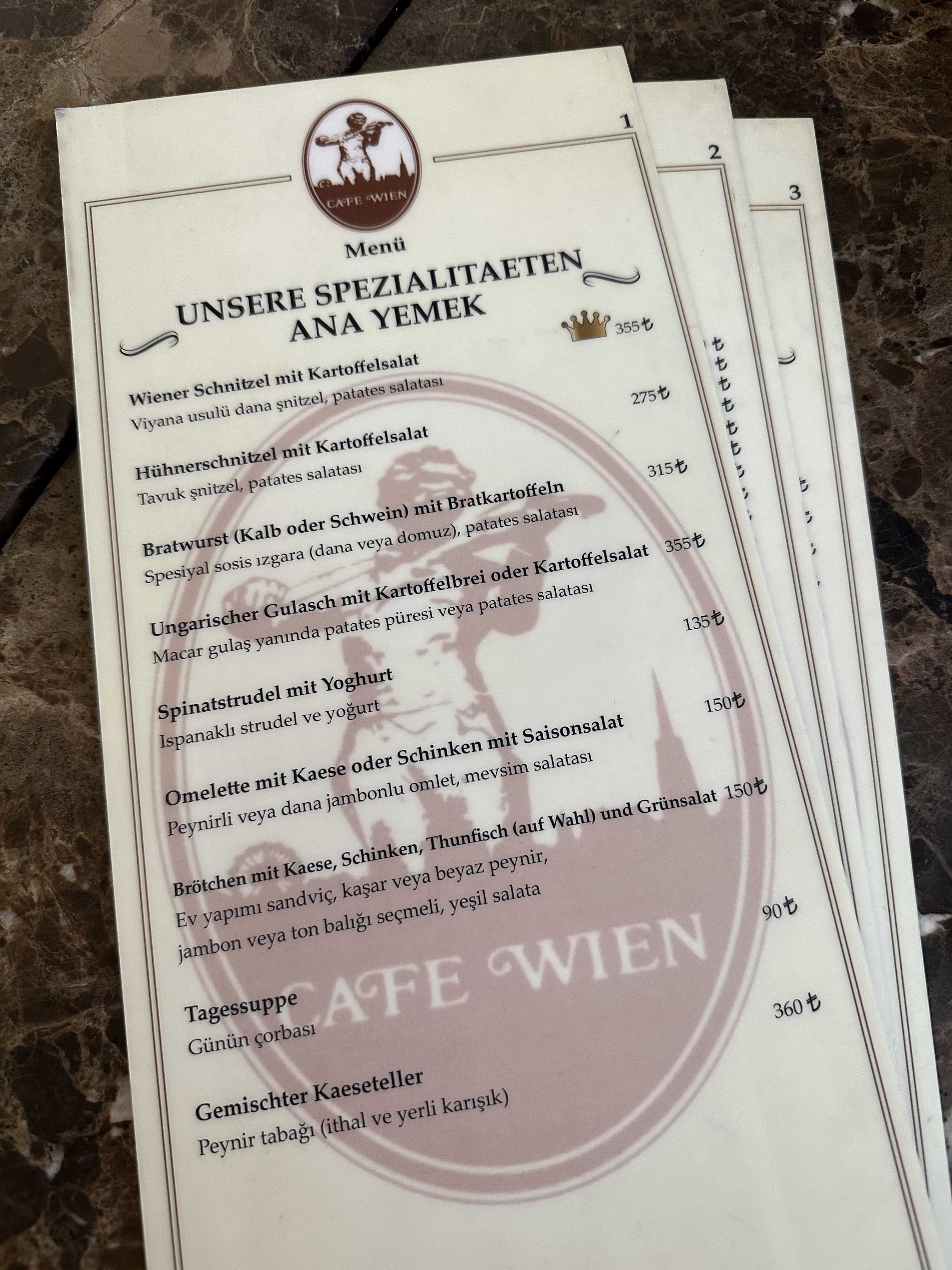 Hem iç tasarımı hem de menüsü ile İstanbul'da Viyana'yı yaşayabileceğiniz bir yer Cafe Wien. Şehirdeki en iyi şinitzellerden biri bu mutfaktan çıkıyor. Yemek sonrası geleneksel lezzetlerden oluşan tatlı menüsü incelemeye değer.